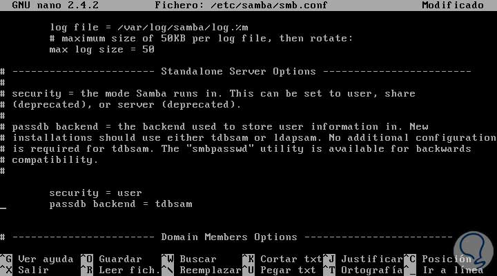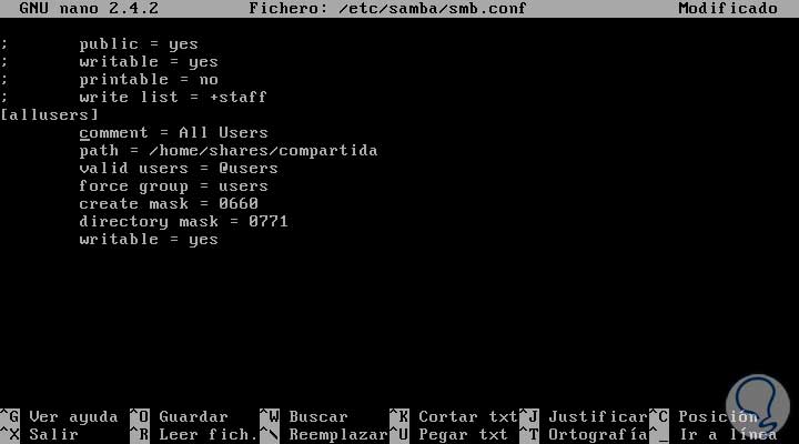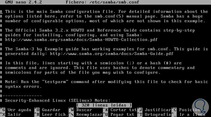 nano /etc/samba/smb.confSe desplegará la siguiente ventana: