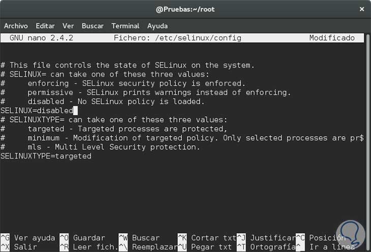 Modificamos el valor SELINUX=enforcing a SELINUX=disabled y guardamos los cambios usando: