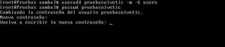 passwd Nombre_UsuarioEn nuestro caso sería passwd pruebasolvetic (debemos ingresar 2 veces la contraseña).
