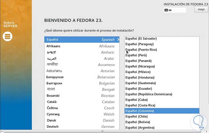 En nuestro ejemplo seleccionamos la primera opción Install Fedora 23, veremos que comienza el proceso de instalación, descargándose los paquetes necesarios para la instalación. A continuación se desplegará la ventana de bienvenida donde en primera medida debemos seleccionar el idioma y el país a instalar en nuestro sistema operativo Fedora 23.