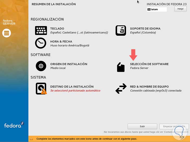 - Install Fedora 23: Inicia la instalación del sistema operativo Fedora 23 de manera inmediata
