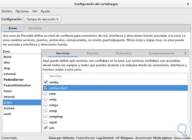 El siguiente paso en nuestra configuración es habilitar el firewall para que habilite la conectividad del cliente, para ello vamos a ir a la ficha Actividades y buscamos la opción Cortafuegos y la ejecutamos. Damos clic en la opción Public y marcamos las casillas de los servicios samba y samba-client.