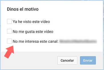 Entre las opciones que se nos presenta, tendríamos que seleccionar “No me interesa este canal” para que ninguno de sus videos apareciese como sugerencia en nuestra cuenta.