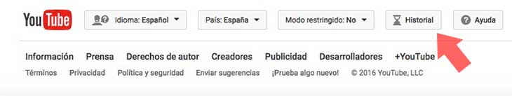 Para comenzar con este proceso por tanto, tenemos que situarnos dentro de la web de YouTube a la parte inferior de la web y seleccionar “Historial”.