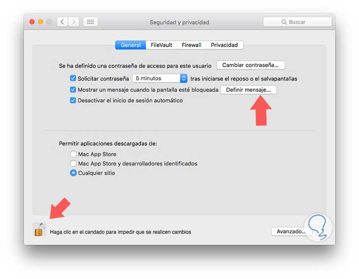 Lo primero que tenemos que hacer es dirigirnos a las “Preferencias del sistema” . “Seguridad y privacidad”. Dentro de este apartado, tenemos que situarnos en la pestaña de “General” y hacer clic sobre el candado situado en la esquina inferior izquierda.