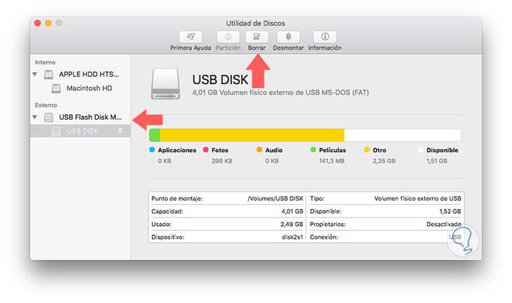 Para comenzar con el proceso debemos abrir “Utilidad de Discos” y a continuación tenemos que seleccionar el volumen que queremos borrar. En este caso vamos a utilizar una unidad externa.