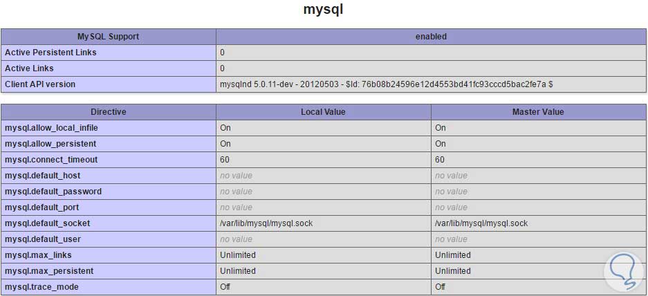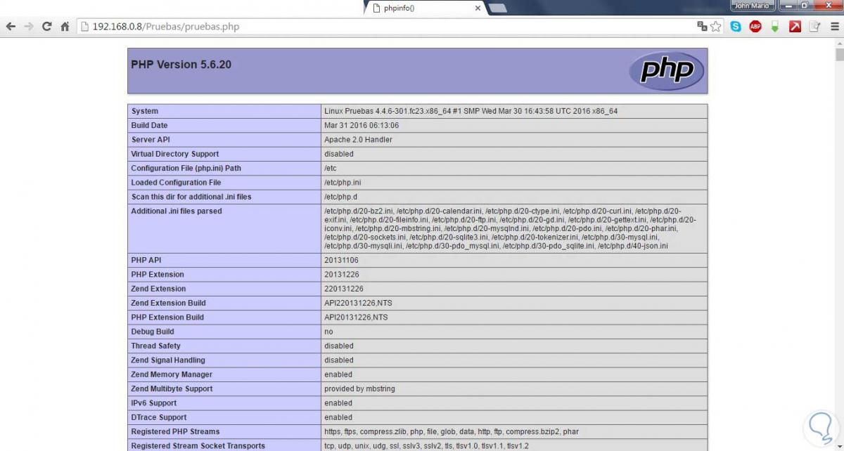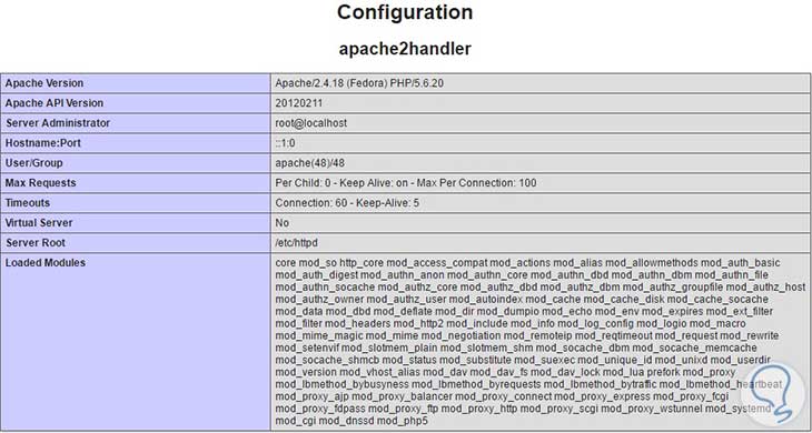 Finalmente nos dirigimos a nuestro navegador e ingresamos la dirección IP seguido del nombre de nuestro archivo. Veremos que se despliega la siguiente ventana con toda la información relacionada al sistema y demás configuraciones.