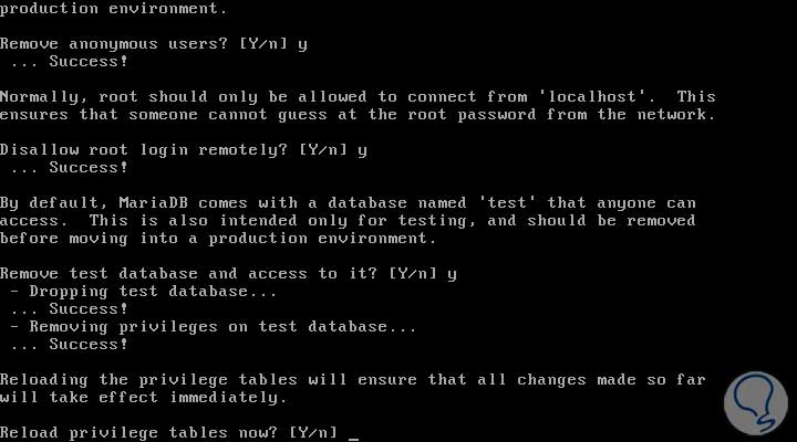 En la pregunta si deseamos establecer password del usuario root ingresamos y (yes) e ingresamos la contraseña y la confirmamos, se despliega lo siguiente: