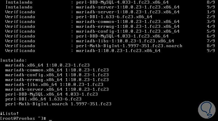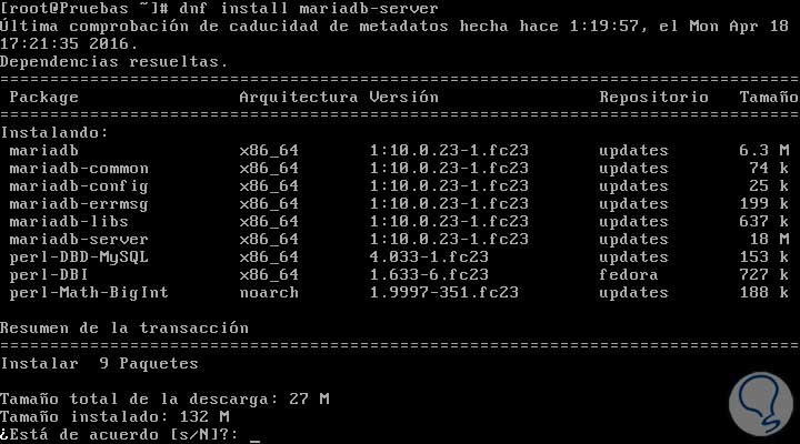 Aceptamos la instalación y comenzará la descarga y posterior instalación de los paquetes de MariaDB, veremos que se ha descargado e instalado de manera satisfactoria mariadb: