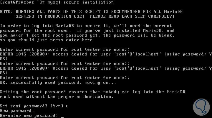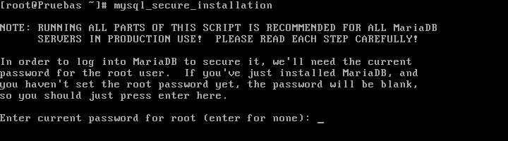 Veremos que una vez ejecutemos el comando se desplegarán una serie de preguntas, inicialmente nos solicita el password de root, damos enter y se desplegará la siguiente ventana: