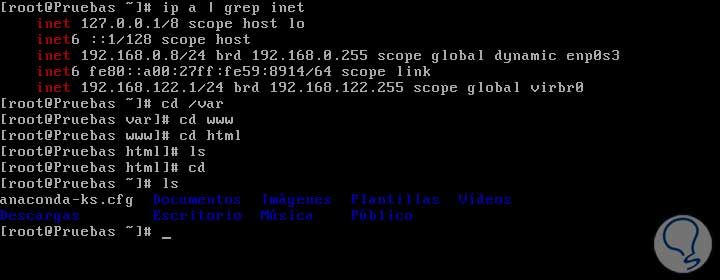 Veremos que Apache httpd está correctamente instalado. El directorio por defecto de Apache http es el siguiente: /var/www/html/, allí debemos ingresar los archivos que necesitemos tener en la web: