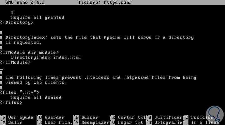 Para ingresar al archivo httpd.conf y ver su contenido usaremos el comando nano httpd.conf. Veremos que se despliega la siguiente ventana, donde podemos movernos usando las flechas de desplazamiento para ver que existen diferentes parámetros: