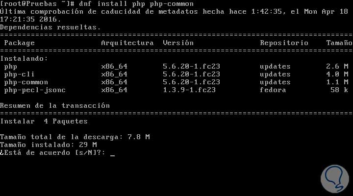 dnf install php php-commonComenzará el proceso de instalación de PHP: