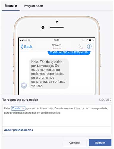 De esta manera habría quedado configurada tanto nuestra respuesta automática, como el intervalo de tiempo en cuanto horas y días seleccionado para que esto se ejecute. En este momento todos aquellos contactos que nos envíen un mensaje a la página durante ese periodo, serán respondidos de manera instantánea con el mensaje que hayamos seleccionado.
