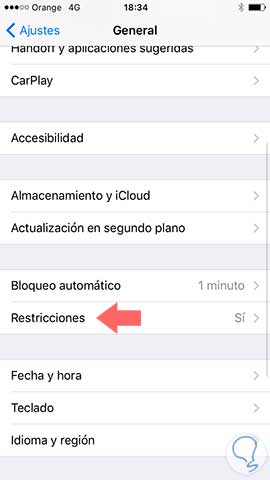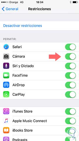 Después pincha en “Activar restricciones”. Introduce tú código para activar restricciones y una vez lo hayas hecho, te vas a “cámara” y arrastras el botón que aparece en verde, para dejarlo en blanco.