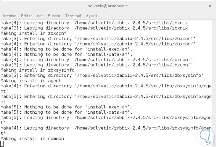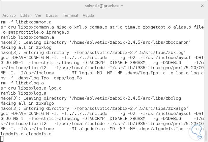Como vemos Zabbix nos indica que podemos correr el comando make, éste nos permite crear los binarios instalables e instalar Zabbix, recordemos que debe ser ejecutado como root, ingresaremos lo siguiente: