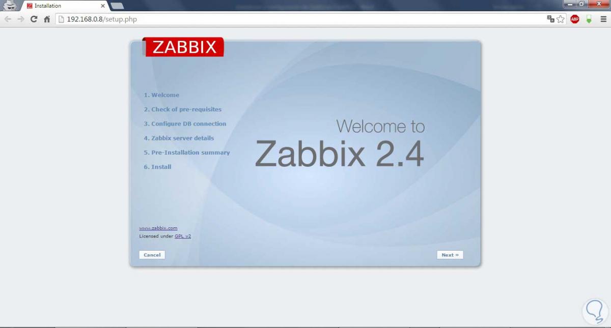 Vamos ahora a instalar la interfaz Frontend de Zabbix para ello debemos ingresar en nuestro navegador la dirección IP de la máquina http:192.168.0.8/setup.php. Veremos que se despliega la siguiente ventana para proceder a realizar la instalación: