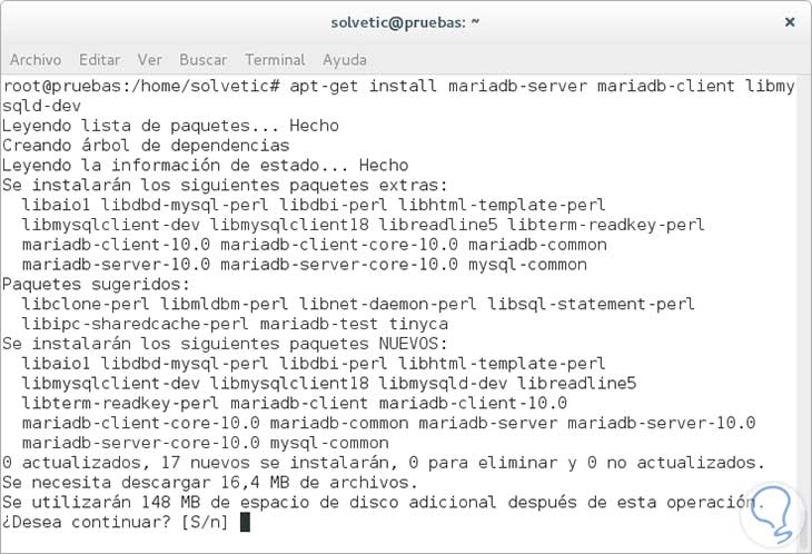 sudo apt-get install mariadb-server mariadb-client libmysqld-dev (si estamos como root suprimir el sudo)En RED HAT / CentOS 7: