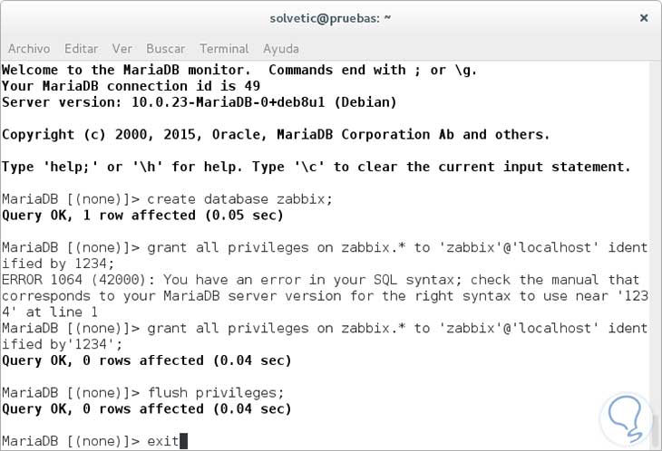 A continuación configuraremos nuestra base de datos MariaDB para Zabbix, vamos a crear un usuario con privilegios para gestionar la base de datos, ingresemos lo siguiente: