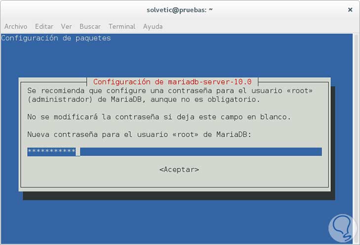 En un momento de la instalación de MariaDB el sistema nos solicitará la contraseña del usuario root de la base de datos, debemos ingresarla y confirmarla (recordemos que debe ser una contraseña segura).