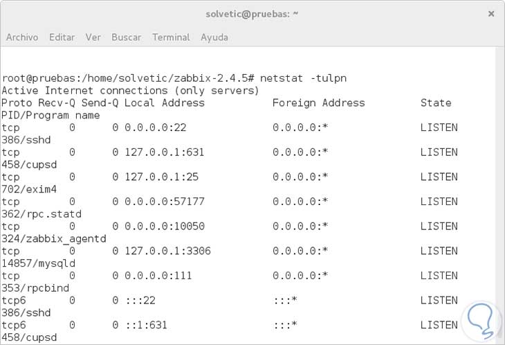 /usr/local/sbin/zabbix_server /usr/local/sbin/zabbix_agentd /usr/local/sbin/zabbix_agentPara obtener el estado de Zabbix y de los puertos de escucha ejecutamos el comando netstat: