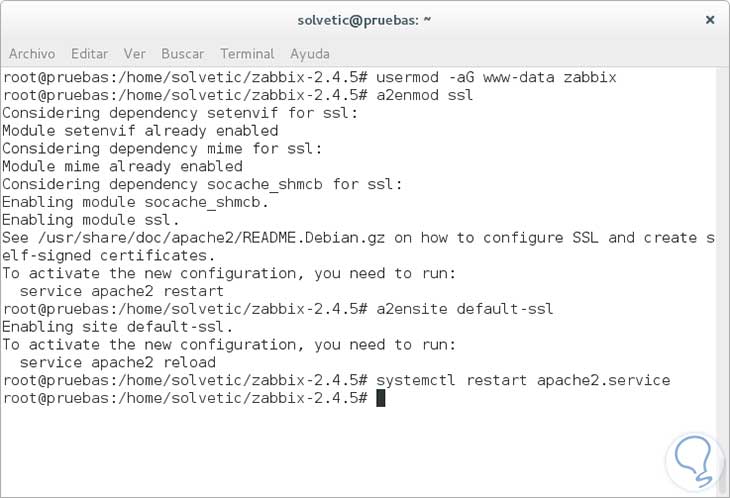 Aquí nuestro objetivo es agregar el usuario Zabbix al grupo del sistema de Apache www-data, habilitar el módulo SSL y el host para poder correr Zabbix de manera segura, recordemos que debemos reiniciar el servicio después de aplicar estos cambios. Ejecutaremos lo siguiente: