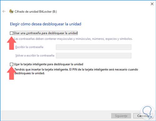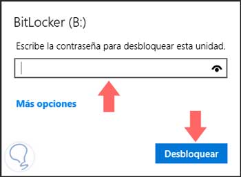 Una vez Windows 10 haya analizado la unidad veremos la siguiente ventana donde debemos especificar cómo vamos a desbloquear la unidad, contamos con las siguientes opciones: