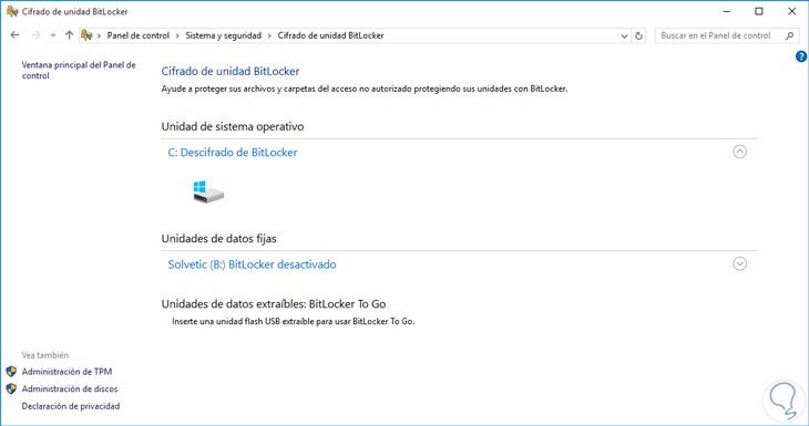 BitLocker usa TPM para validar el arranque del sistema y así garantizar que el disco duro está en óptimas condiciones de seguridad y funcionamiento lo cual ayudará a la seguridad de nuestros datos en Windows 10.