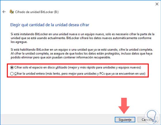 El siguiente paso es seleccionar la cantidad de espacio que deseamos cifrar de la unidad, como vemos contamos con dos opciones.