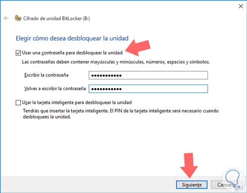 En nuestro caso vamos a elegir “Usar una contraseña para desbloquear la unidad”, una vez seleccionada esta opción debemos ingresar la contraseña deseada para proteger nuestra unidad.