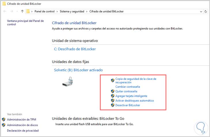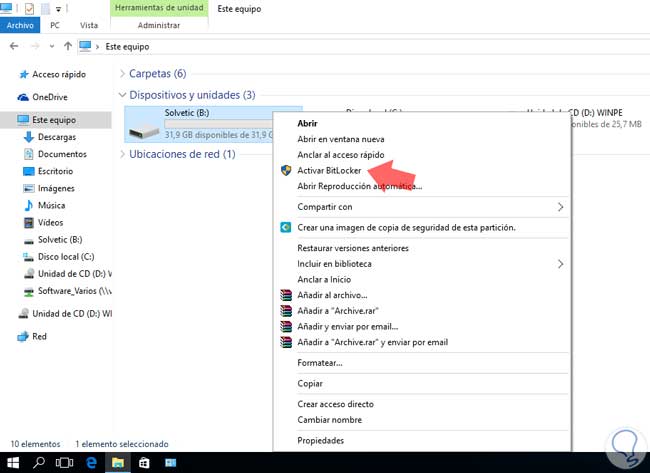 En nuestro caso vamos a activar BitLocker en la unidad B llamada Solvetic y para comenzar daremos clic derecho sobre la unidad y seleccionamos la opción Activar BitLocker.