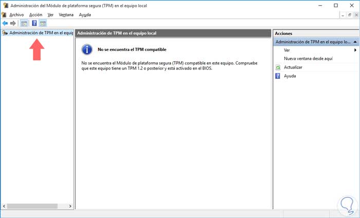 Allí seleccionaremos la opción Administración de TPM para comprobar si nuestro equipo es compatible o no con TPM. Vemos en este caso que nuestro equipo con Windows 10 no es compatible con TPM.