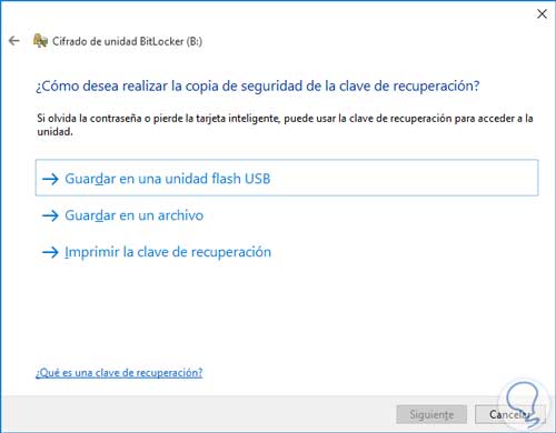 Pulsamos Siguiente y a continuación debemos seleccionar dónde se guardará la clave de recuperación de BitLocker.