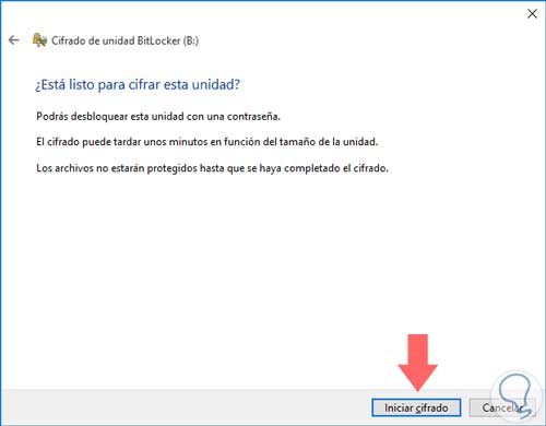 Elegimos la que más se adecue a nuestra necesidad y pulsamos Siguiente. Veremos el siguiente mensaje y si estamos seguros del proceso simplemente daremos clic en Iniciar cifrado.