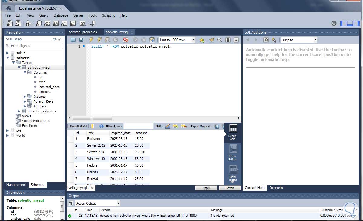 select title, expired_date, amount from solvetic_mysql where id < '5';El resultado final será el siguiente: