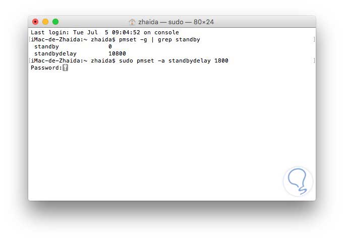 sudo pmset -a standbydelay #Por ejemplo si queremos que pasados 30 minutos del modo de suspensión pretendemos que entre en espera, tendríamos que ejecutar el siguiente comando. Al introducir nuestra contraseña, el cambio entrará en vigor inmediatamente.