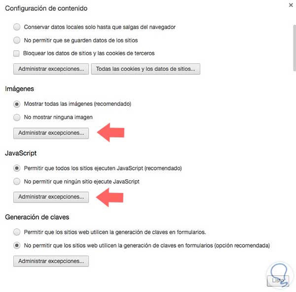 Ahora es el momento de que busquemos el apartado de “Imágenes” y “JavaScript”. En ambos casos tenemos que seleccionar la opción de “Administrar excepciones”.
