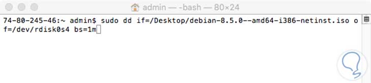 sudo dd if=/Desktop/debian-8.5.0-amd64-i386-netinst.iso of=/dev/rdisk0s4 bs=1m