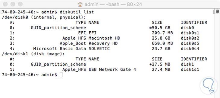 Podemos observar que se despliegan todas las unidades del equipo. Una vez tengamos esta información vamos a determinar donde se ha de almacenar la imagen ISO, en este caso la vamos a almacenar en el dispositivo Solvetic cuyo identificador es disk0s4.