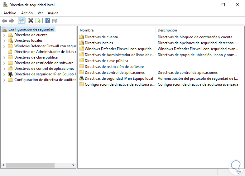 Se nos abrirá la ventana de Directiva de seguridad local Windows 10 para que podamos gestionar diferentes opciones.