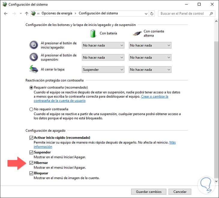 Como vemos, en la siguiente imagen podéis seleccionar o desactivar la opción Hibernar para que aparezca en el menú de inicio al intentar apagarlo. También la de Suspensión, inicio rápido, o el poder bloquear el equipo. Al darle a Guardar cambios. Podemos ver que podríamos Hibernar Windows 10 a la hora de apagarlo (antes no te aparecía esa opción).