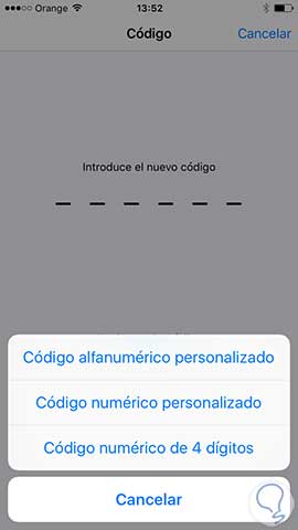 Vamos a observar en la pantalla tres opciones disponibles. Podemos establecer un código numérico de 4 dígitos, un código numérico personalizado o un código alfanumérico personalizado.