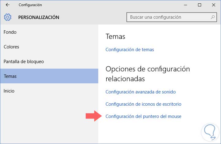 En la ventana que se abre debemos pinchar en la pestaña Temas, y dentro hacemos click en la opción Configuración del puntero del mouse.