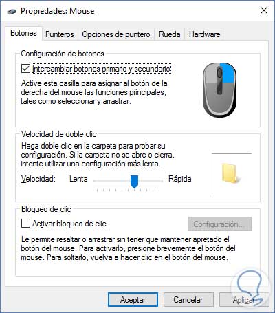 En la nueva ventana, tenemos varias pestañas con diferentes opciones para configurar el ratón, vamos a ver algunas de las cosas qué podemos hacer. Hay que tener en cuenta que al terminar de hacer nuestros cambios deberemos dar click en Aceptar, para que estos se guarden.