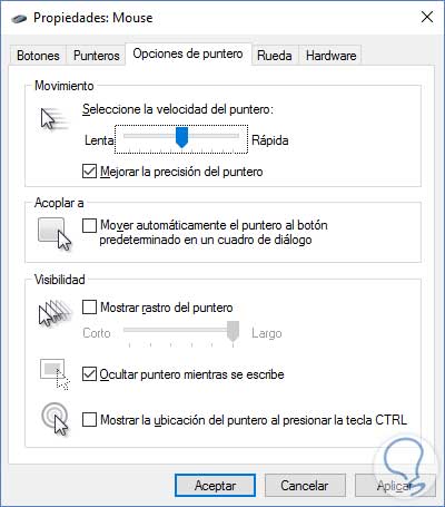 Vamos a la pestaña Opciones del puntero y vemos que tenemos varias partes de configuración, dentro de Movimiento podemos elegir que la velocidad sea más rápida o más baja (a no ser que ya lo tengas en un extremo y solo se pueda aumentar o disminuir la velocidad).