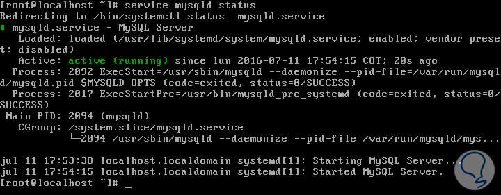 service mysqld startPara validar el estado actual de MySQL en CentOS 7 vamos a ingresar lo siguiente en la terminal: