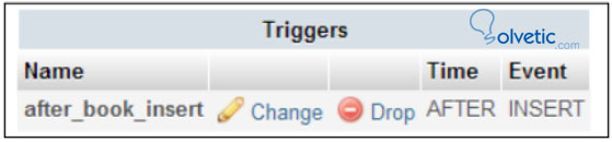 Una vez creado el Trigger al ir a la página de estructura de la tabla lo veremos disponible: