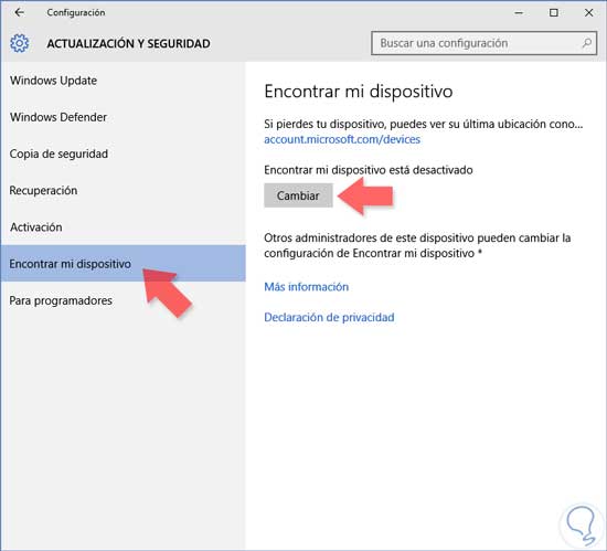 En esta ventana nos situaremos en el menú de la izquierda en Encontrar mi dispositivo y veremos opciones en la parte derecha. Pulsa debajo de Encontrar mi dispositivo está apagado, en Cambiar para poder activarlo.