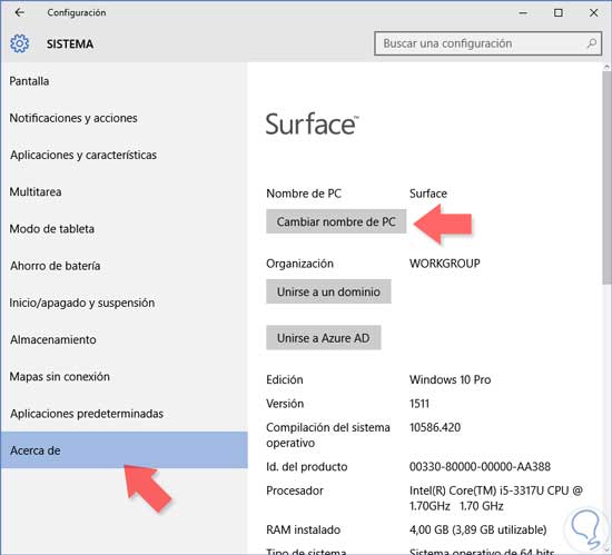 En la nueva ventana, selecciona en la parte izquierda del menú la opción de Acerca de y en la parte derecha selecciona Cambiar nombre de PC.