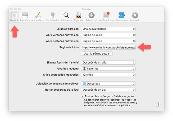 En primer lugar tenemos que abrir el navegador para acceder a sus preferencias desde el menú superior. Una vez dentro de las preferencias, tenemos que situarnos en la pestaña de “general” para poder acceder al apartado en el que pone “página de inicio” y de este modo poder introducir la URL la cual queremos establecer.